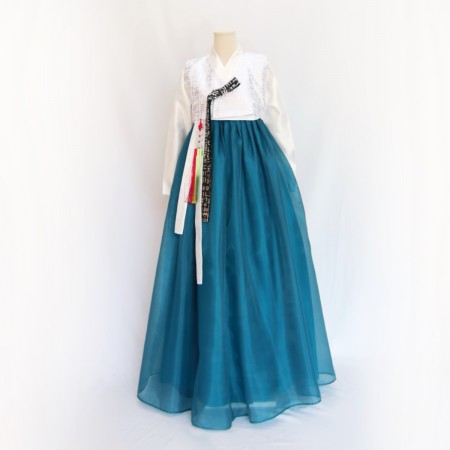 한글 패턴이 들어있는 저고리가 특징인 전통한복의 합창복입니다.