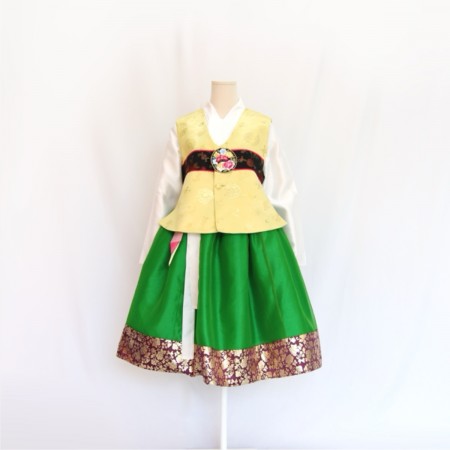 초록빛 치마와 연두빛 당의 스타일의 퓨전 한복입니다.