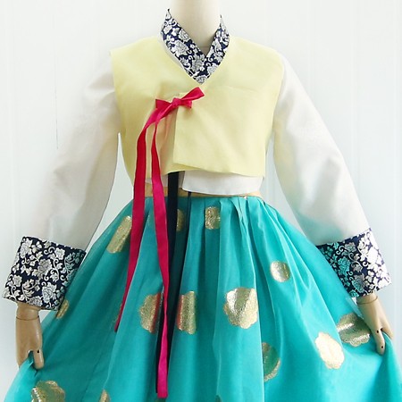 화려한 청녹색치마와 연노랑 저고리가 멋스러워요.